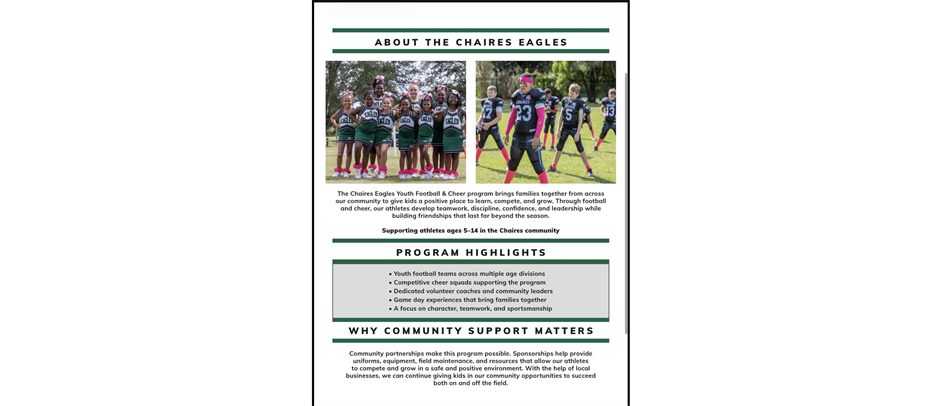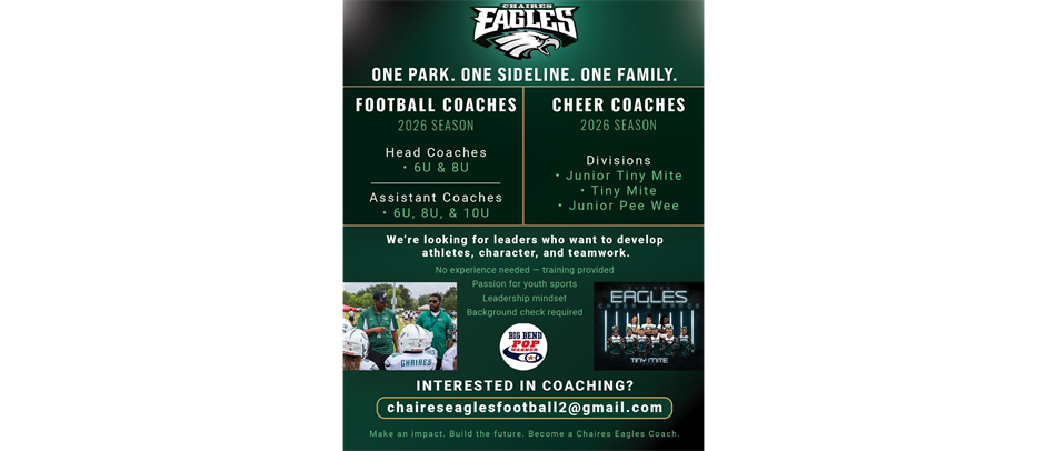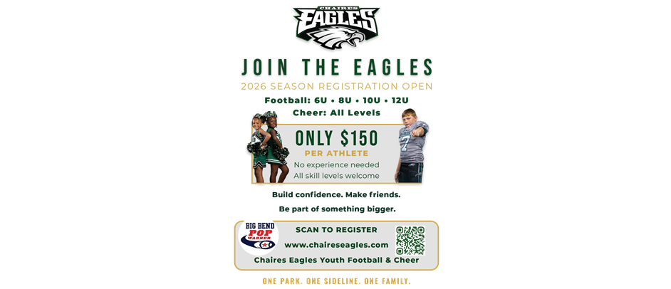 Dear Chaires Eagles Football and Cheer Families,Thank you for your interest in our 2026 season! We’re excited to have returning and new families preparing for another great year.